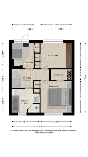 Overloop, 1 slaapkamer met deur naar het platte dak en inbouwkast, tweede slaapkamer met dubbele inbouwkast, 3e slaapkamer met (sier) balken plafond en inloopkast. De voorste slaapkamers zijn voorzien van een hor en twee slaapkamers zijn voorzien van elektrische rolluiken.