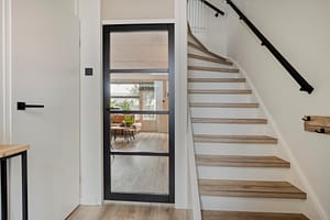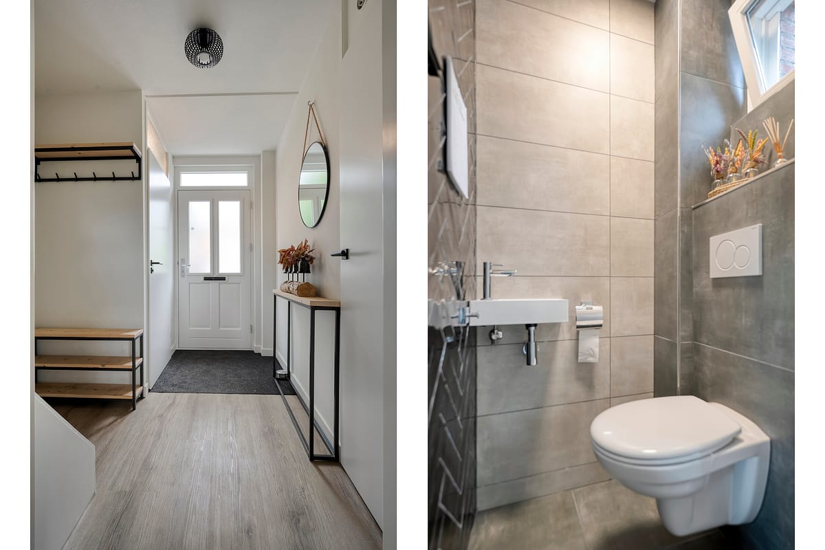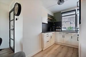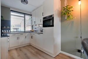 Begane grond Entree, hal met garderobe, gemoderniseerd toilet met wandcloset en fonteintje, trapopgang, tuingerichte woonkamer met veel lichtinval; met handige trapkast met opstelplaats voor de waterontharder en deur naar de achtertuin, open keuken met in 2022 gemoderniseerd keukenblok in lichte kleurstelling voorzien van inductiekookplaat, wasemkap, koelkast, combi-oven en een vaatwasser).