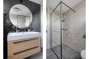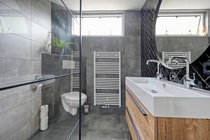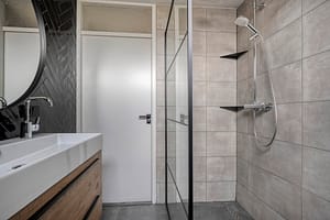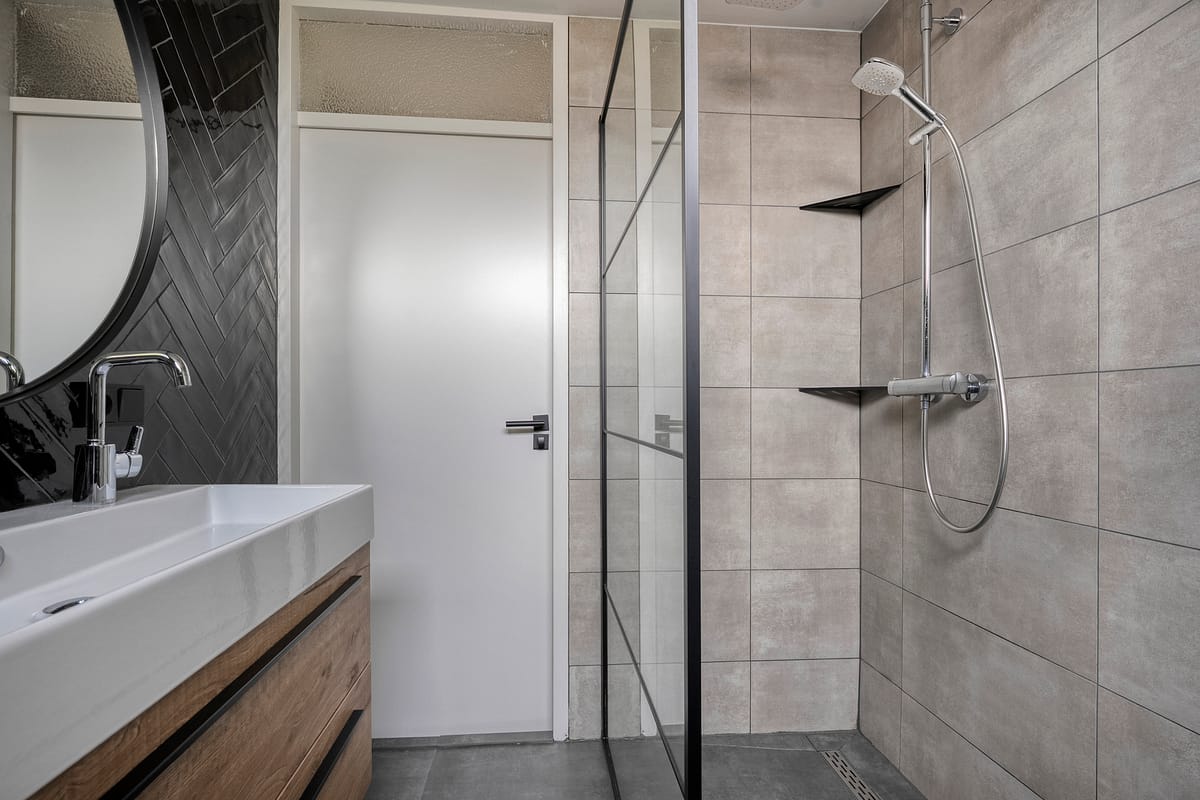1e verdieping: Overloop, 3 slaapkamers, in 2022 gemoderniseerde badkamer voorzien van inloopdouche, badkamermeubel met dubbele wastafel en een wandcloset.