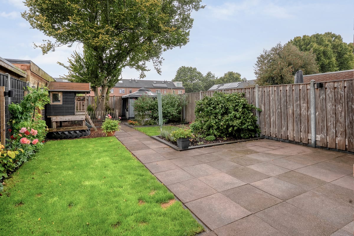 Achter de tuin is een fraai aangelegde en goed onderhouden tuin gelegen. De tuin is gesitueerd op het westen en grenst aan een speeltuin.