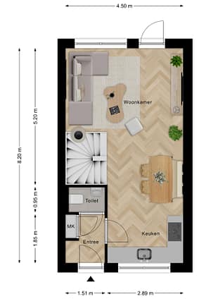 Begane grond: Entree; hal; meterkast; toilet; woonkamer met toegang naar de achtertuin en een open keuken.