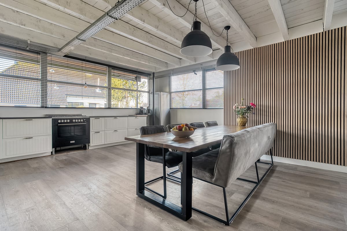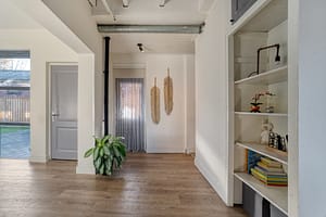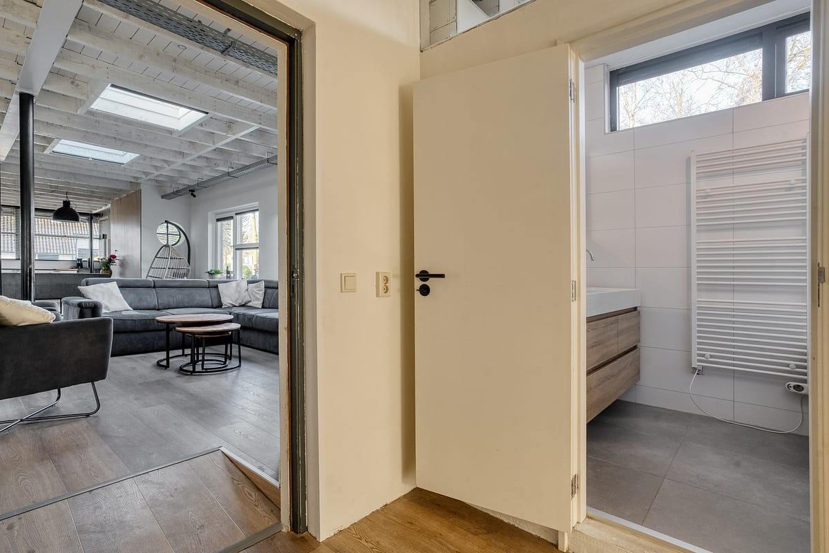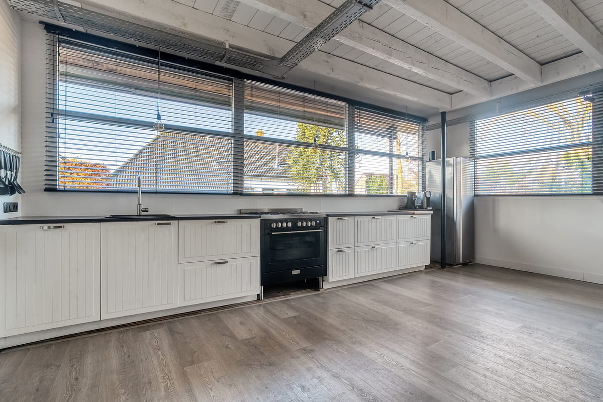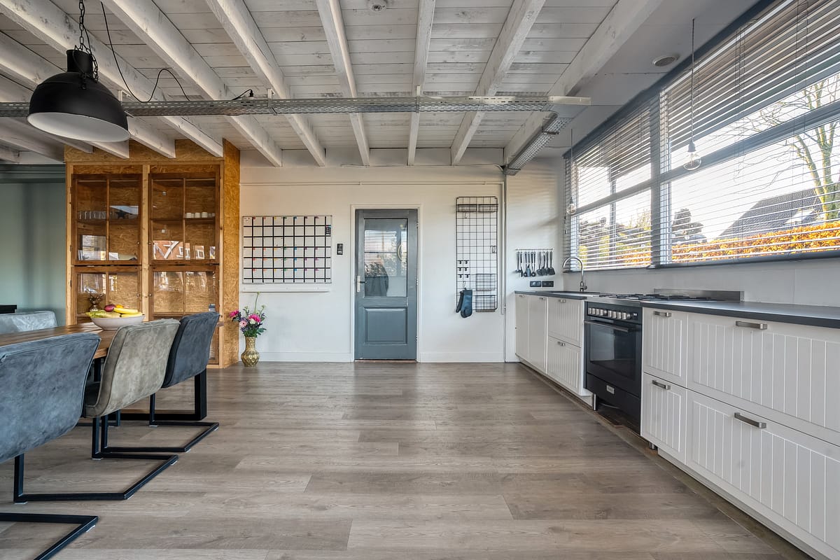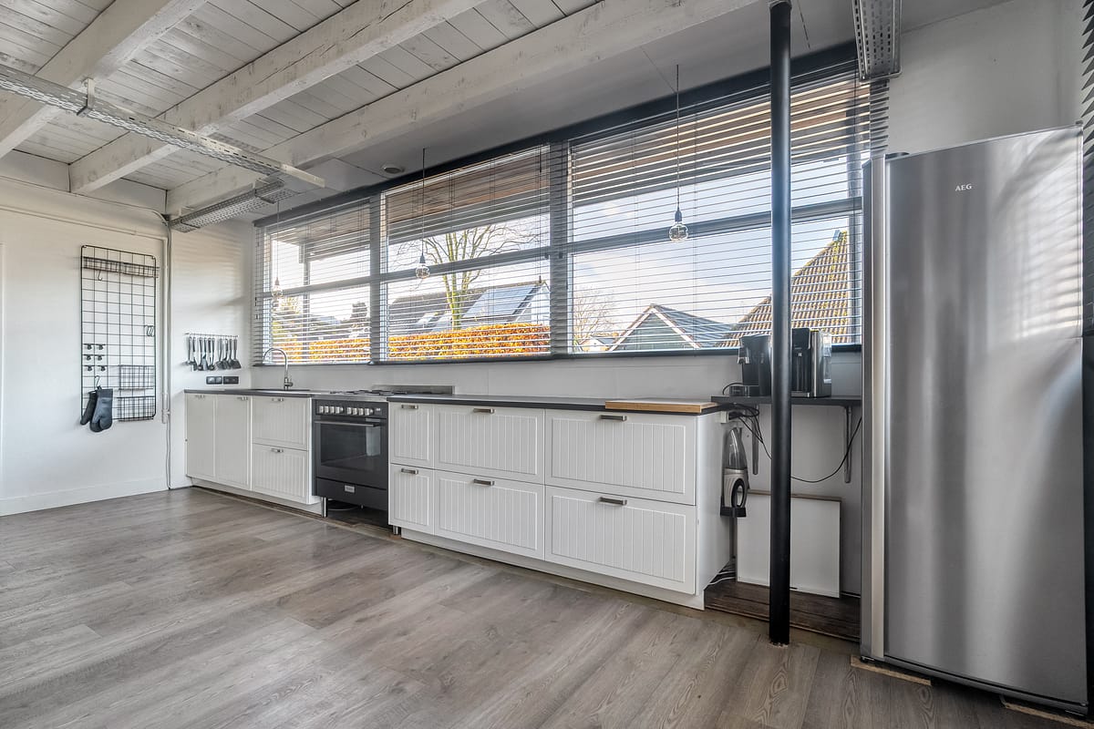 Ruime open keuken voorzien van diverse inbouwapparatuur, hele ruime en lichte woonkamer met houtkachel, nette vloerafwerking, vaste kasten en twee dakramen, kantoorhoek, bijkeuken met opstelling CV-combiketel, gootsteen en witgoedaansluitingen, gang, toilet, vaste kast, doorgang naar achtergelegen aanbouw met daar een hal, een badkamer voorzien van inloopdouche, ligbad en wastafelmeubel, een witgoedkast, 2 slaapkamers, multifunctionele ruimte met airco en openslaande terrasdeuren, twee inloopkasten en een pantry.