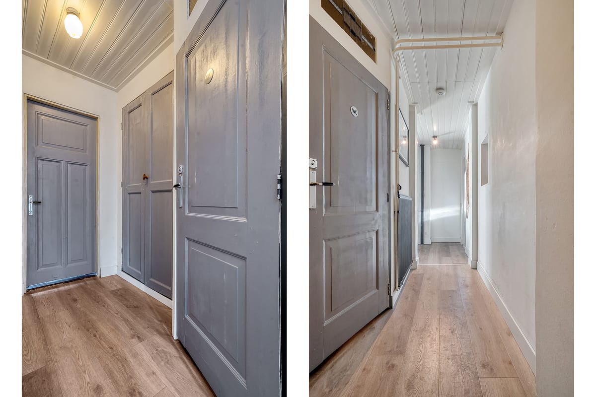 Entree, hal, trapopgang, kelder, meterkast, woonkamer voorzien van fraaie oude houten vloer, open keuken, mooie oude vaste kast, openslaande deuren naar mooie ruime veranda, doorloop naar grote woonkamer in het nieuwe gedeelte, vaste kast en toilet.