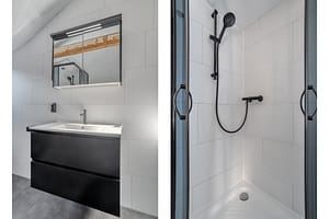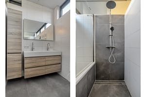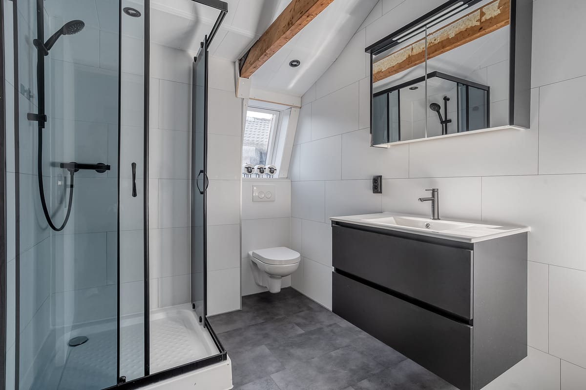 Vaste trap naar verdieping: overloop met dakkapel, vaste kast, bergkamer, 2 ruime slaapkamers voorzien van airco, badkamer voorzien van ruim wastafelmeubel, douchecabine en toilet.