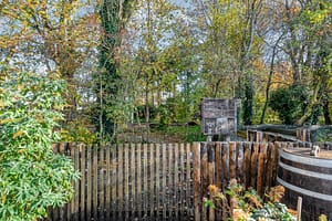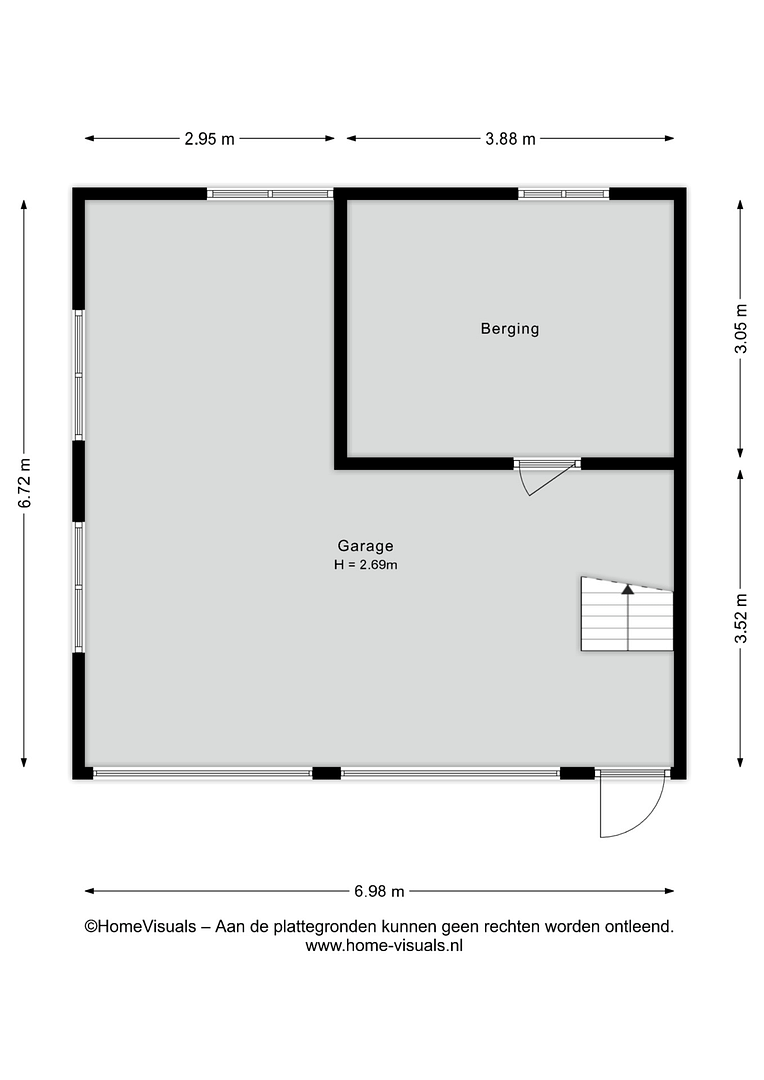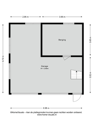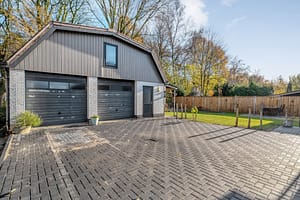 De vrijstaande garage/schuur heeft een oppervlak van ca. 6.7 x 7 m. en bestaat uit garageruimte, bergruimte, vaste trap naar een hele grote bergruimte. Aan de garage vast bevindt zich een houtstek.
