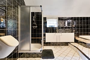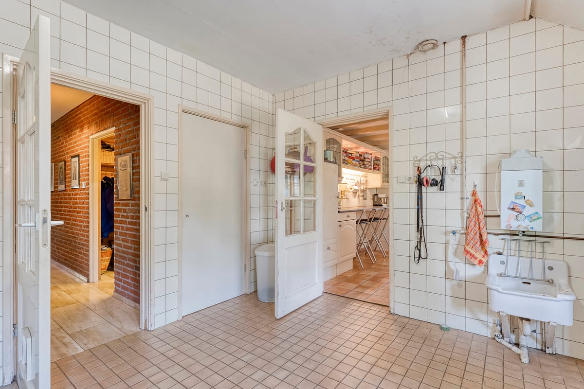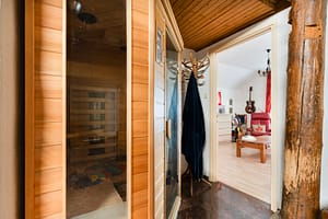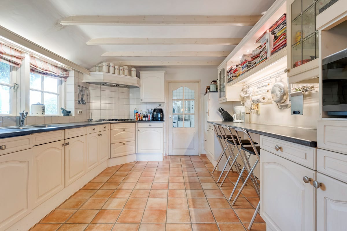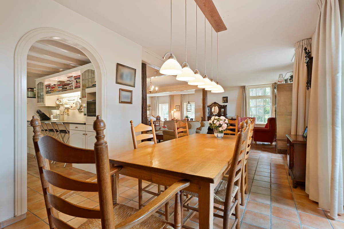 Begane grond: Entree, ruime hal, hangend toilet met fontein, gang met garderobe, royale sfeervolle woonkamer met gezellige houtkachel, balkenplafond, gebinten en openslaande tuindeuren, toegang tot keldertje, keuken voorzien van diverse inbouwapparatuur en een close-in boiler, bijkeuken met provisieruimte en witgoedaansluitingen, grote multi-functionele ruimte voorzien van fraaie granieten natuurstenen vloer, met daaraan 4 mooie slaapkamers, een hobbyruimte met aanrecht, een sauna en een badkamer voorzien van ligbad, bidet, toilet, douchecabine en wastafelmeubel. De grootste slaapkamer is tevens voorzien van openslaande tuindeuren en geeft toegang tot de 2e badkamer met douche en een wastafelmeubel.