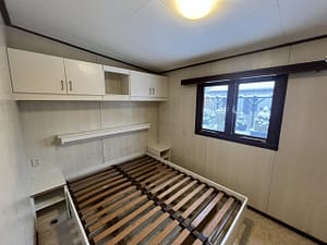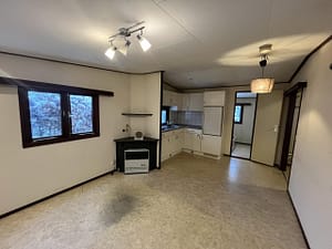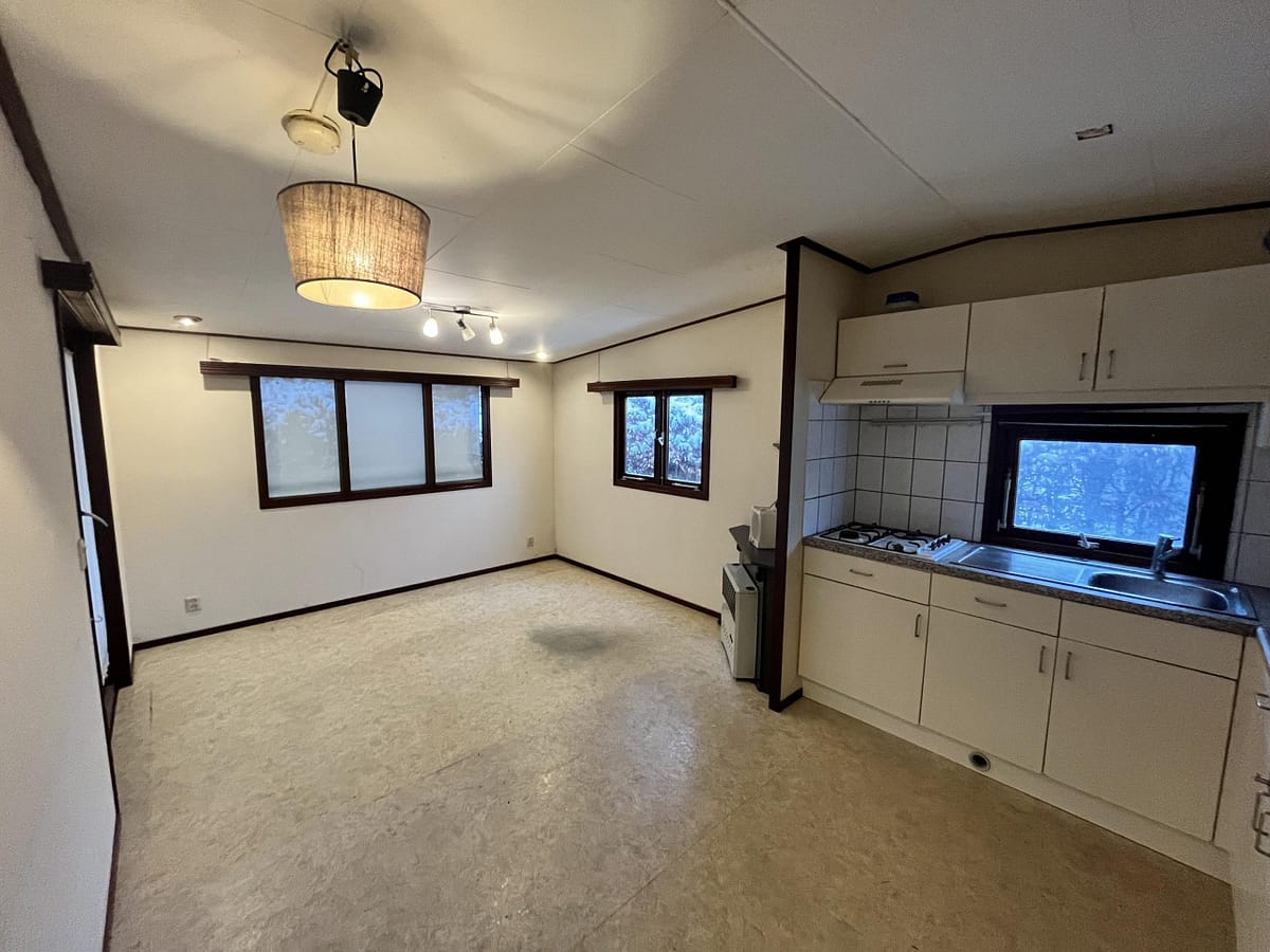 Entree; woonkamer met openslaande deuren naar het overdekte terras, open keuken met keukenblok in hoekopstelling welke is voorzien van een gaskookplaat en een wasemkap; 2 slaapkamers, inpandige berging met aansluiting voor de wasmachine, separaat toilet, en een badkamer met douchecabine en wastafel.